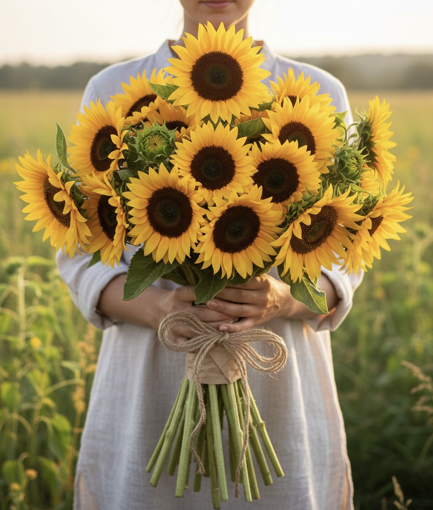 Lleno de luz, alegría y energía, este ramo combina girasoles frescos de gran porte con hojas verdes que resaltan su vitalidad. Cada flor irradia optimismo y calidez, convirtiendo cualquier espacio en un lugar más brillante y acogedor. Perfecto para regalar, celebrar momentos especiales o decorar con estilo, este ramo transmite felicidad y buenos deseos en cada detalle.